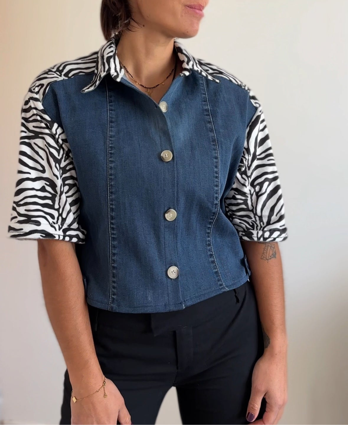 Coupe courte structurée, manches mi-longues, détails contrastés.