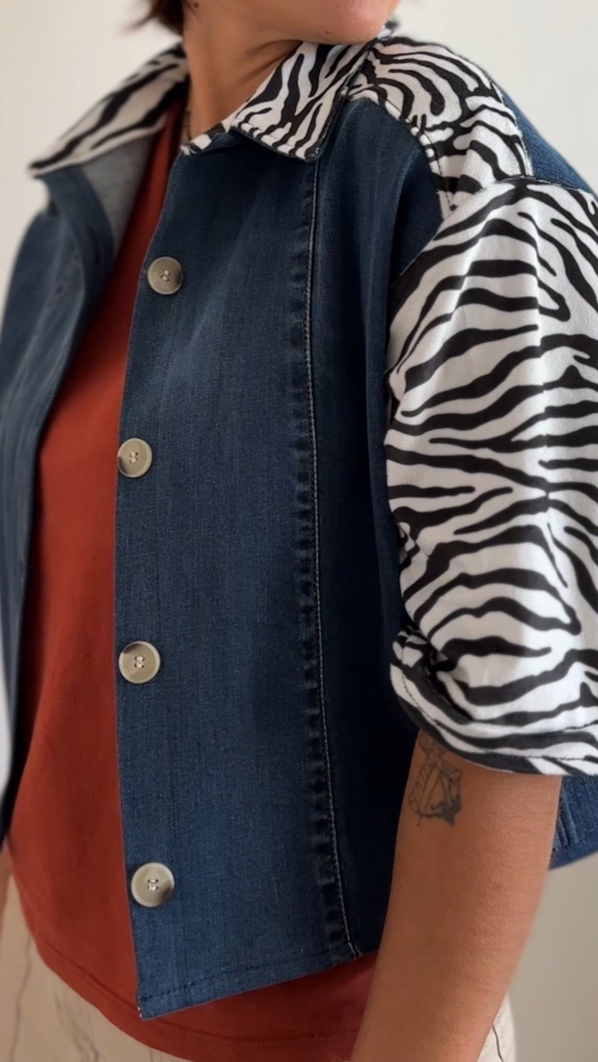 Pièce unique créée à partir de denim revalorisé et de tissus à motifs.