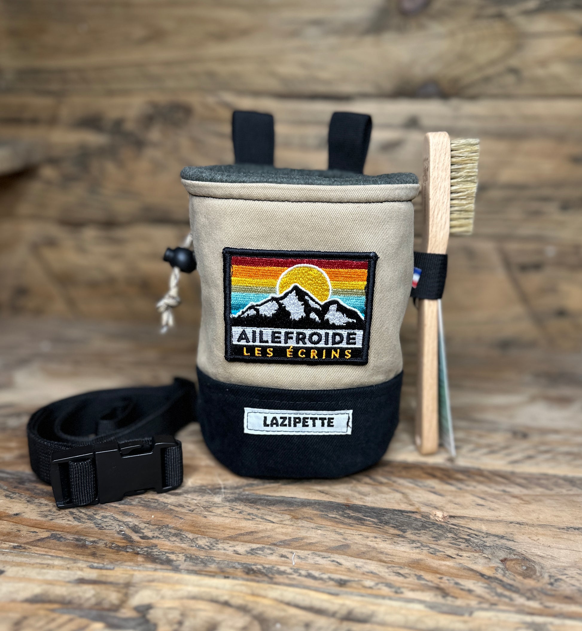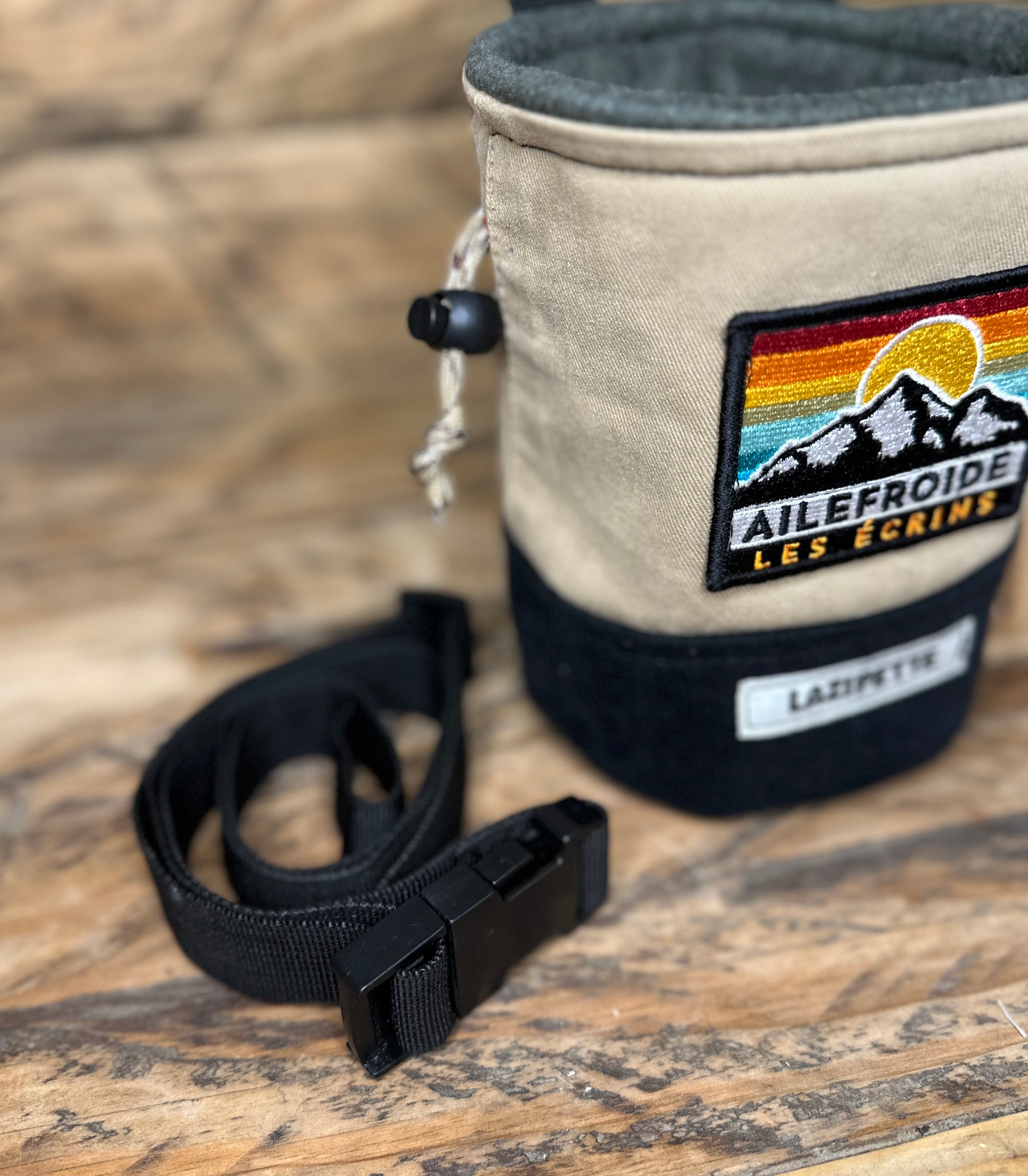 Ceinture à clip réglable assortie au sac à magnesie. Fournie.