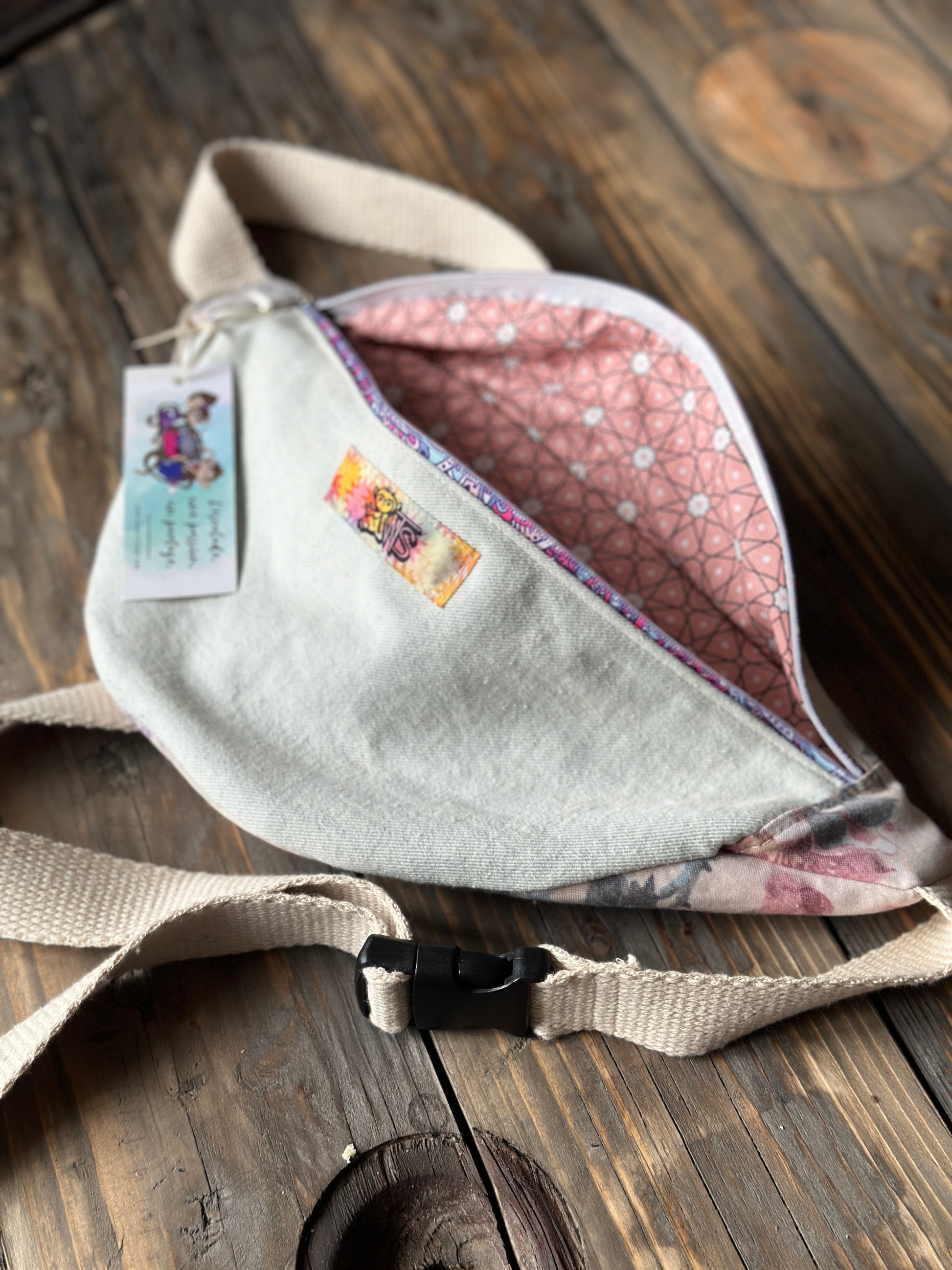 Sac banane en jean et coton fait à la main - style vintage avec des couleurs pales romantique.